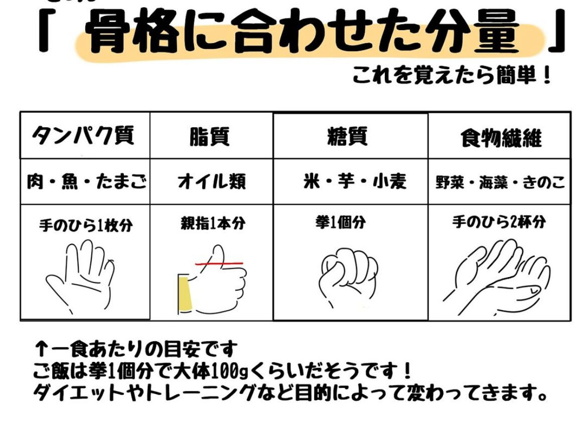 上記の画像のようにそれぞれの食材の分量を図ることによって、それぞれに合った最適な食事量を決定することができます!